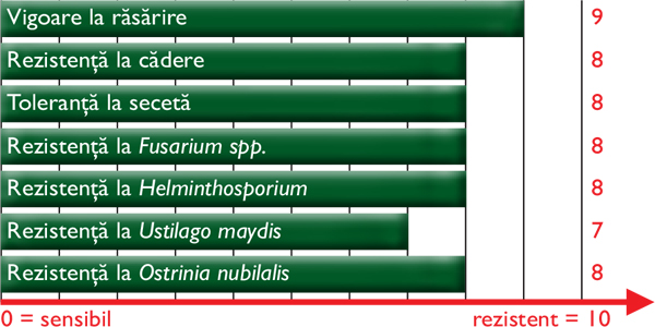 • Recomandat a se cultiva atât pentru producţia de boabe, cât şi pentru siloz; • Hibrid tolerant la secetă.