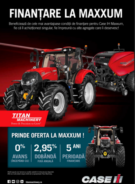 Titan Machinery România desfășoară în această perioadă o campanie de finanțare pentru tractorul de ultimă generație Case IH Maxxum oferind cele mai avantajoase condiții: