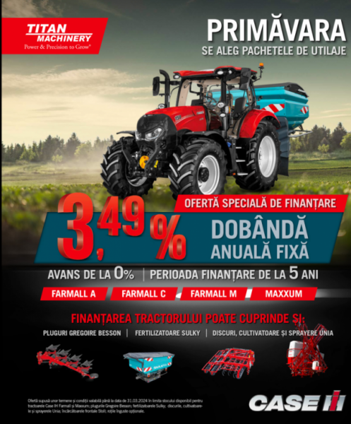 Titan Machinery România desfăsoară în această perioadă o campanie specială de finanțare unui tractor din gamele Farmall și Maxxum. Perioada de finanțare este de la 5 ani, cu avans 0% și cu o dobândă anuală fixă de 3,49%.