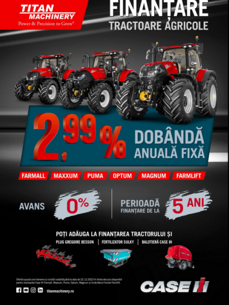 Titan Machinery vine și mai aproape de posibilitățile fiecărui fermier din România cu o ofertă de finanțare foarte avantajoasă pentru cea mai mare parte dintre tractoarele pe care le comercializează.