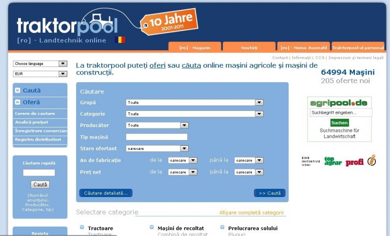 Traktorpool este un site care contine utilaje agricole second hand din toate tarile din Europa. Tractoare agricole , horticole, de diferite puteri , combine pentru recoltat , utilje de pregatire a solului pentru cultivare , semantori, masini pentru intretinere a cculturilor agricole, instalatii zootehnice, piese de schimb si componente second hand.