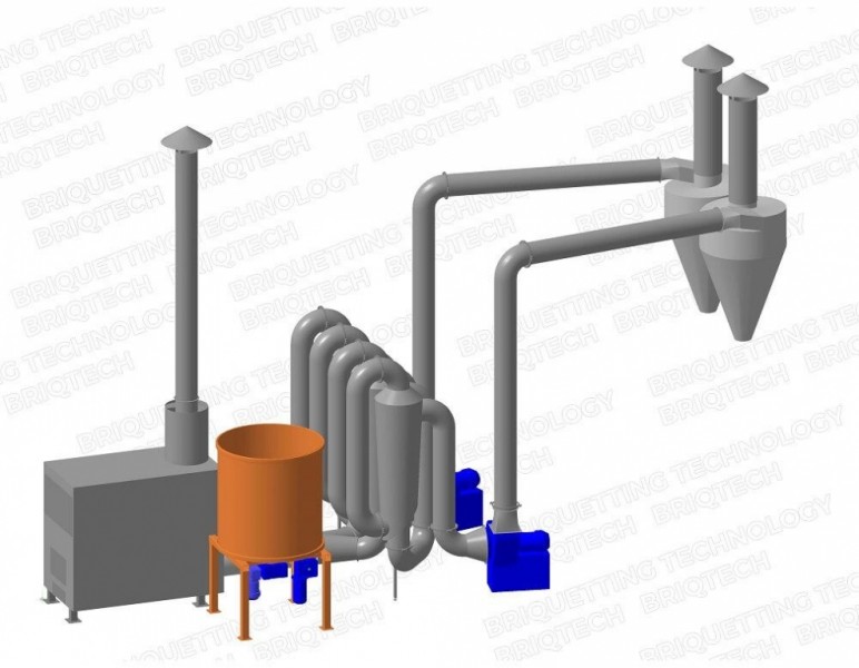 În procesul de uscare, aerul rece, cu ajutorul Schimbătorul de căldură (Soba) încălzește şi se amestecă cu materia prima umeda. Resturile vegetale - Paie, este uscat timp de câteva secunde. Apoi, materia prima uscata prin ciclon cade în presa de brichetat sau în buncărul de omogenizare a materiei prime uscate, iar aerul de evacuare este ventilat în atmosfera.