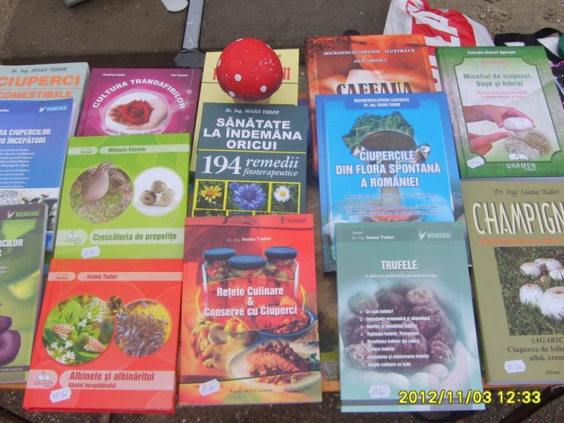 Autor, vand si cu plata ramburs in toata tara prin posta sau curier rapid, urmatoarele carti : Tehnologie champignon, Pleurotus, TRUFE, Ciuperci comestibile si medicinale, Ganoderma, Shiitake, s.a., Retete culinare si conserve cu ciuperci, Cultura ciupercilor pentru incepatori, GHIDUL ciupercilor din flora Romaniei, Sanatatea la indemana oricui cu plante medicinale,Ghidul culegatorului de ciuperci, Albinele si albinaritul, MIEREA alimentul complet, Preparate vegetariene si conserve din ciuperci,Producerea miceliului, Rase de caini, Cafeaua, Crescatoria de prepelite, Cultura trandafirilor, tel,0745420536,www. totuldespreciuperci.blogspot.ro