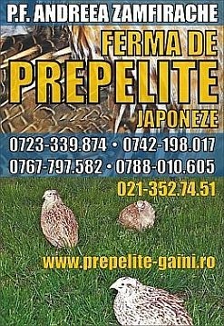 Vand prepelite si pui de prepelita la diferite varste, preturi rezonabile: pui de prepelita la 3 sapt. - 4 lei/buc; pui de prepelita la 4 sapt.-6 lei/buc pui de prepelita la 5 sapt.-8 lei/buc;pui de prepelita la 6-7 sapt.-10 lei/buc.,oua de prepelita pentru consum, tratament naturist si incubatie, 0.3 lei/buc,carne de prepelita la caserola 30 lei/kg, baterii profesionale pentru cresterea prepelitelor outoare, vand ingrasamant natural de prepelita ( dejectii de prepelita).